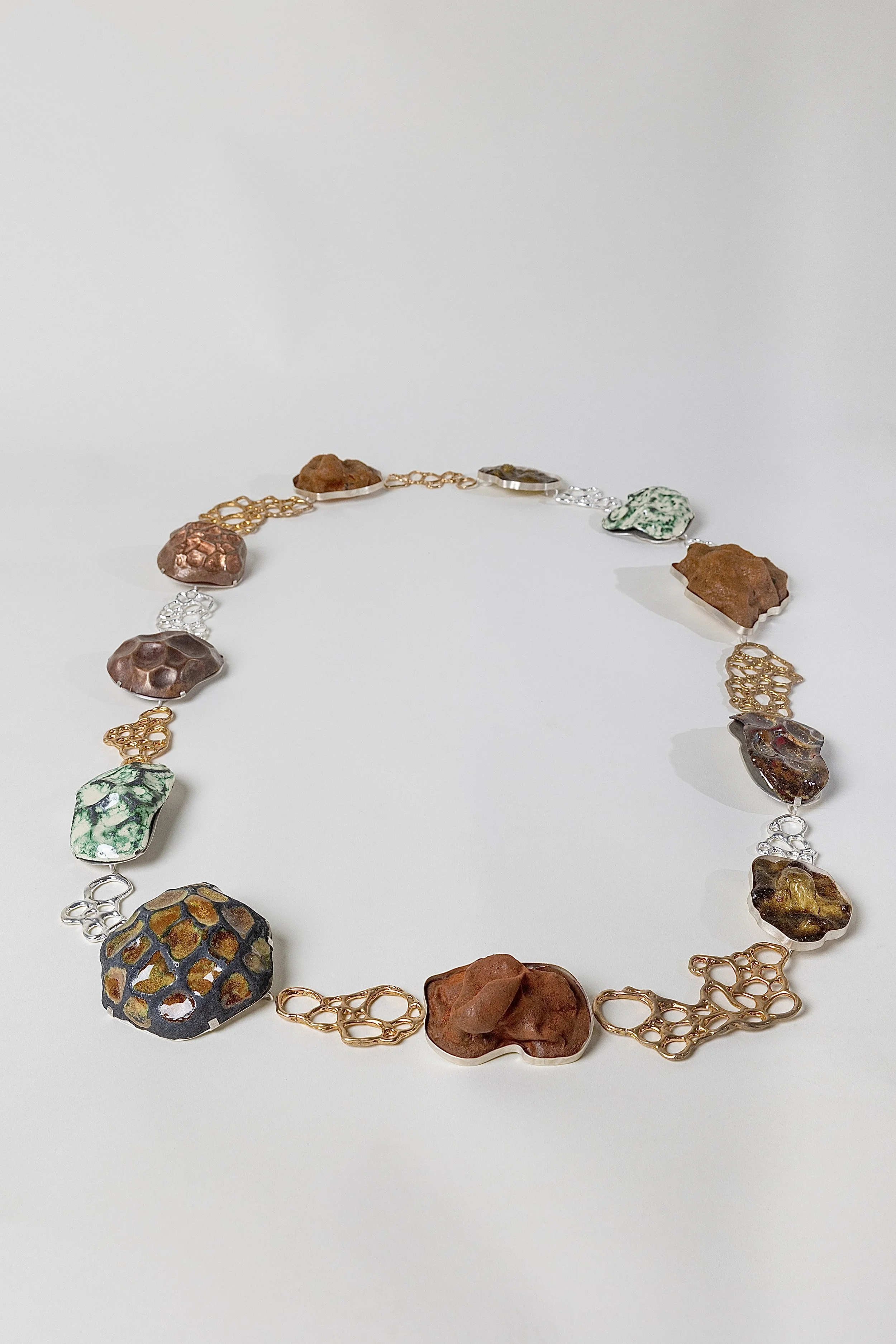 "Materia" è una collana trasformabile in spille, ispirata ai processi di erosione e sedimentazione che modellano le rocce nel tempo. Le sue volumetrie e forme organiche richiamano paesaggi plasmati dagli agenti atmosferici, mentre le tonalità terrose e corpose, evocano la consistenza e la memoria della terra. Attraverso questa opera si invita a riconnettersi con il ritmo paziente della materia, a rallentare, ad ascoltare il tempo profondo delle cose e a riscoprire la nostra appartenenza alla natura.