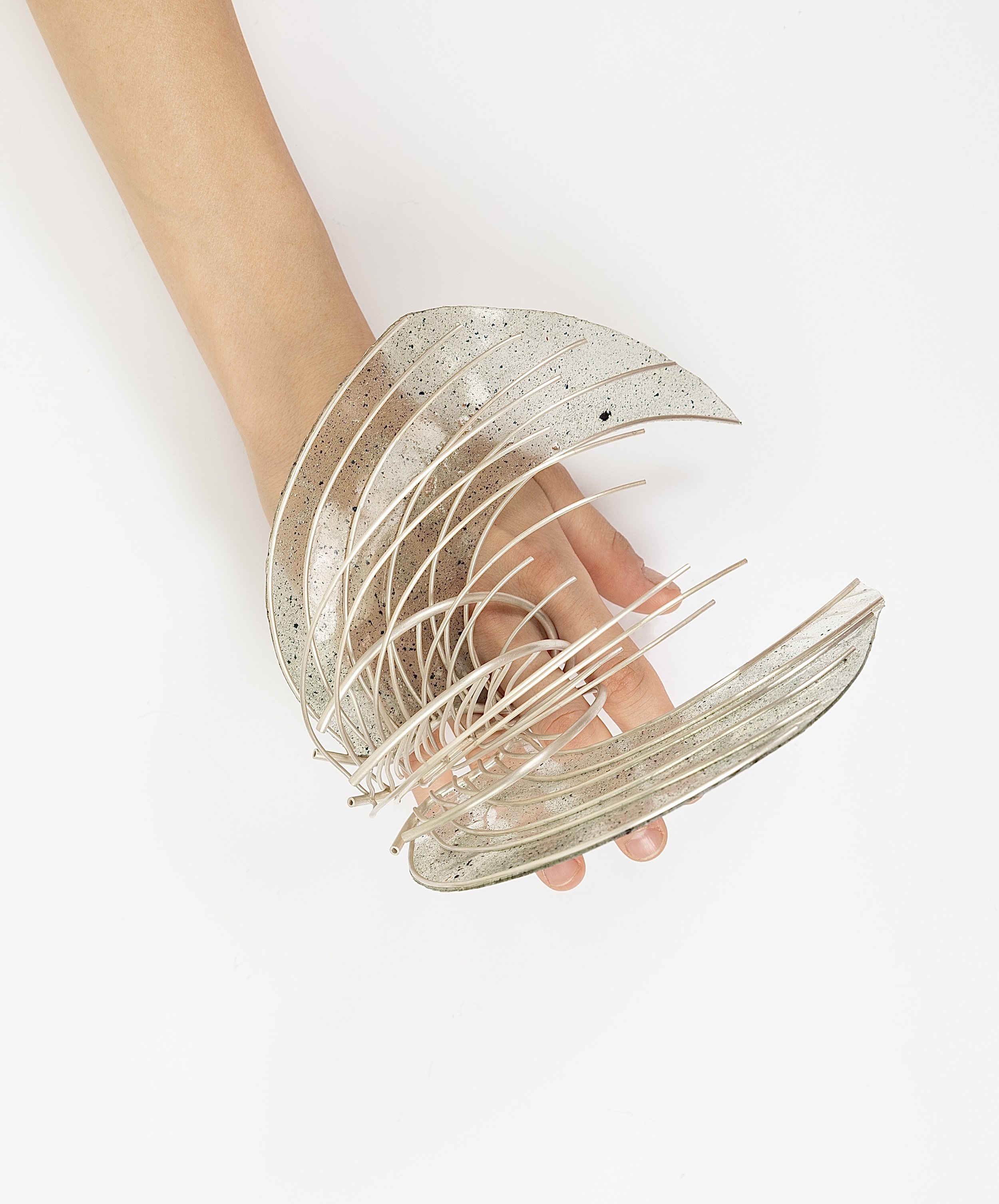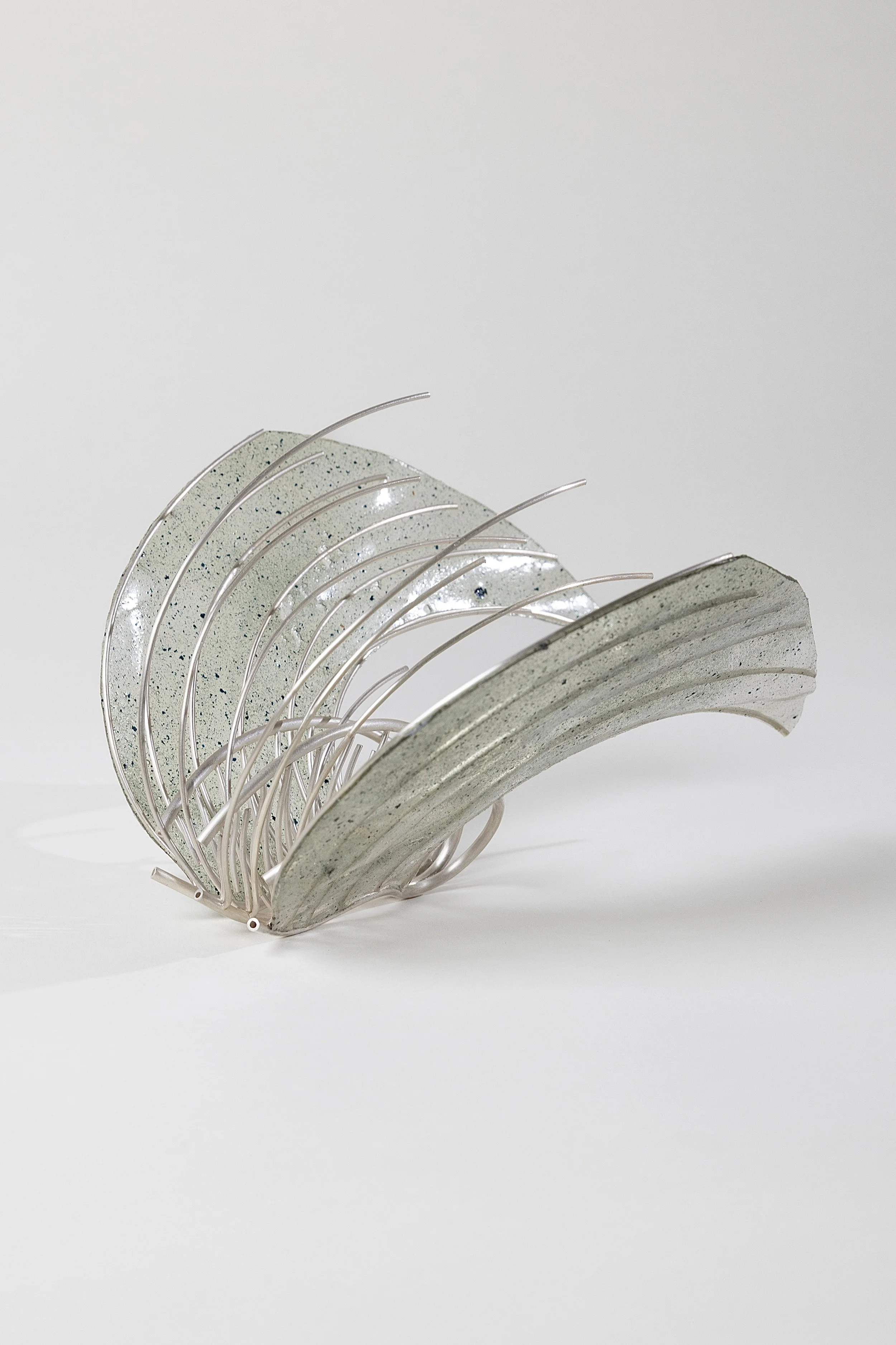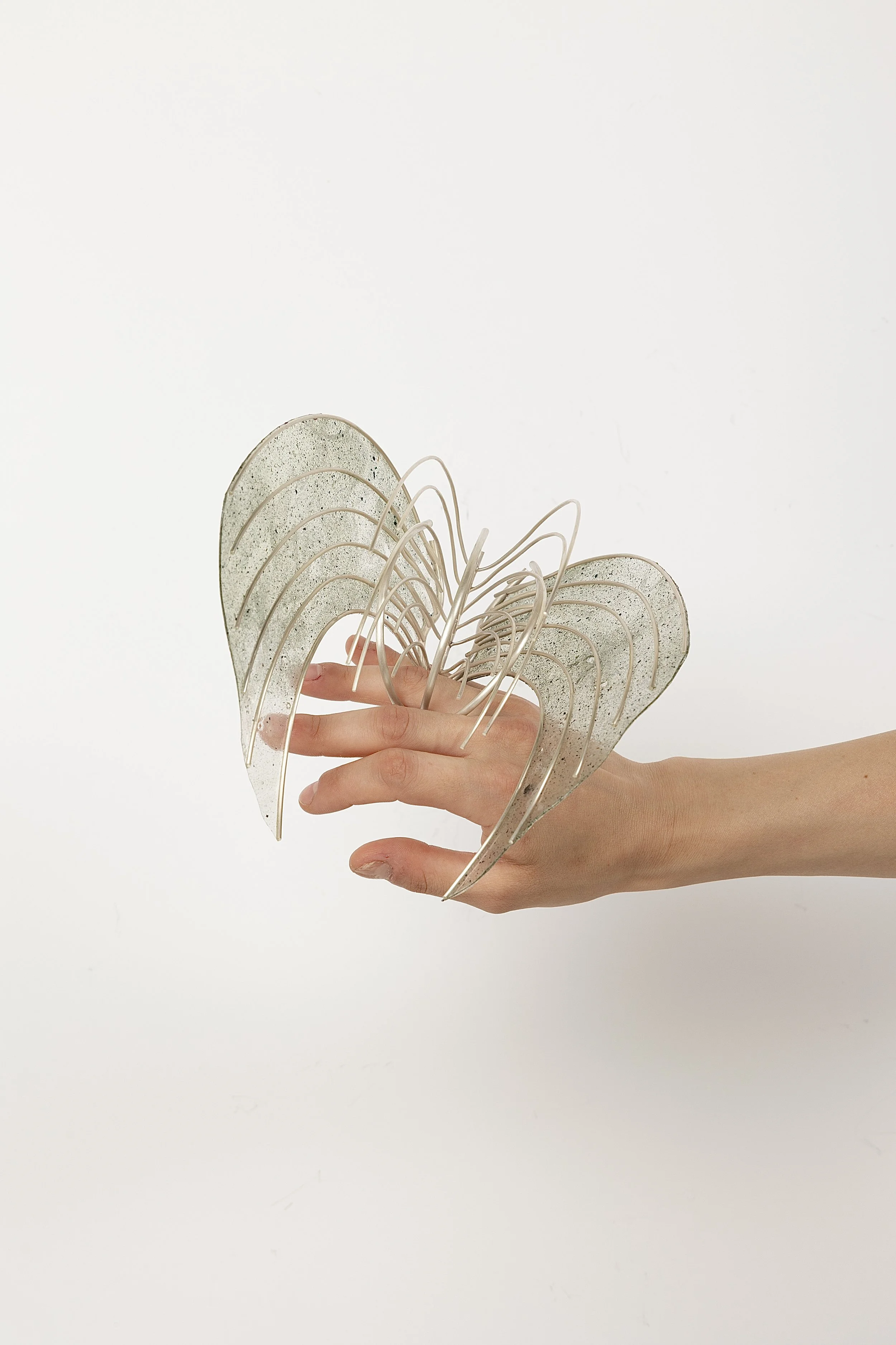 Le sue forme evocano esoscheletri marini, fragili e complessi, testimoni di una resilienza invisibile.
