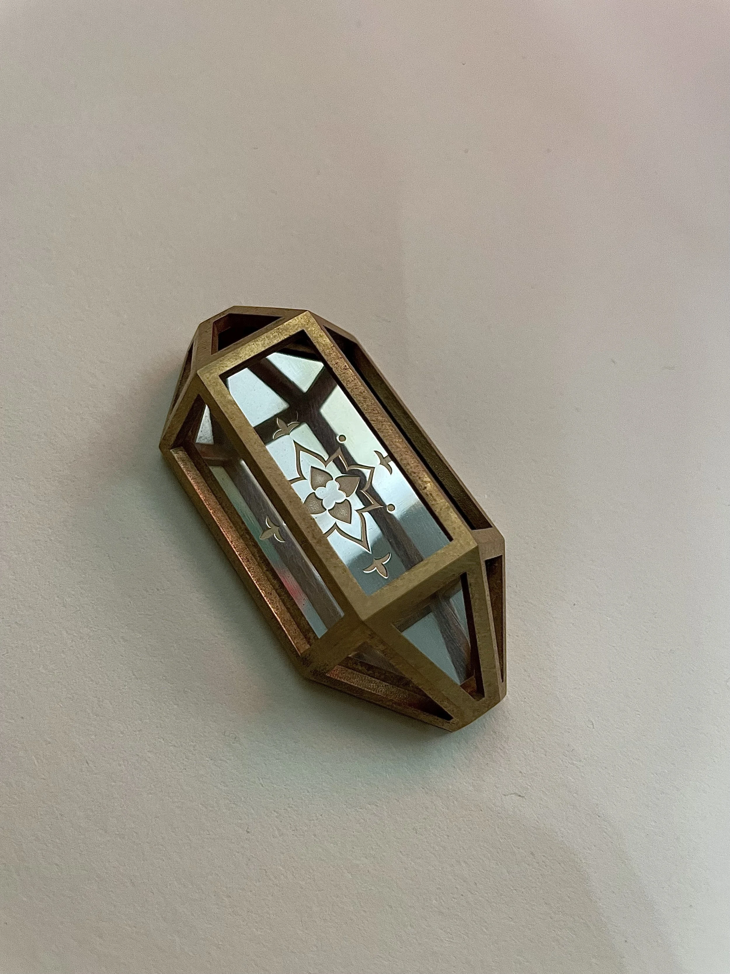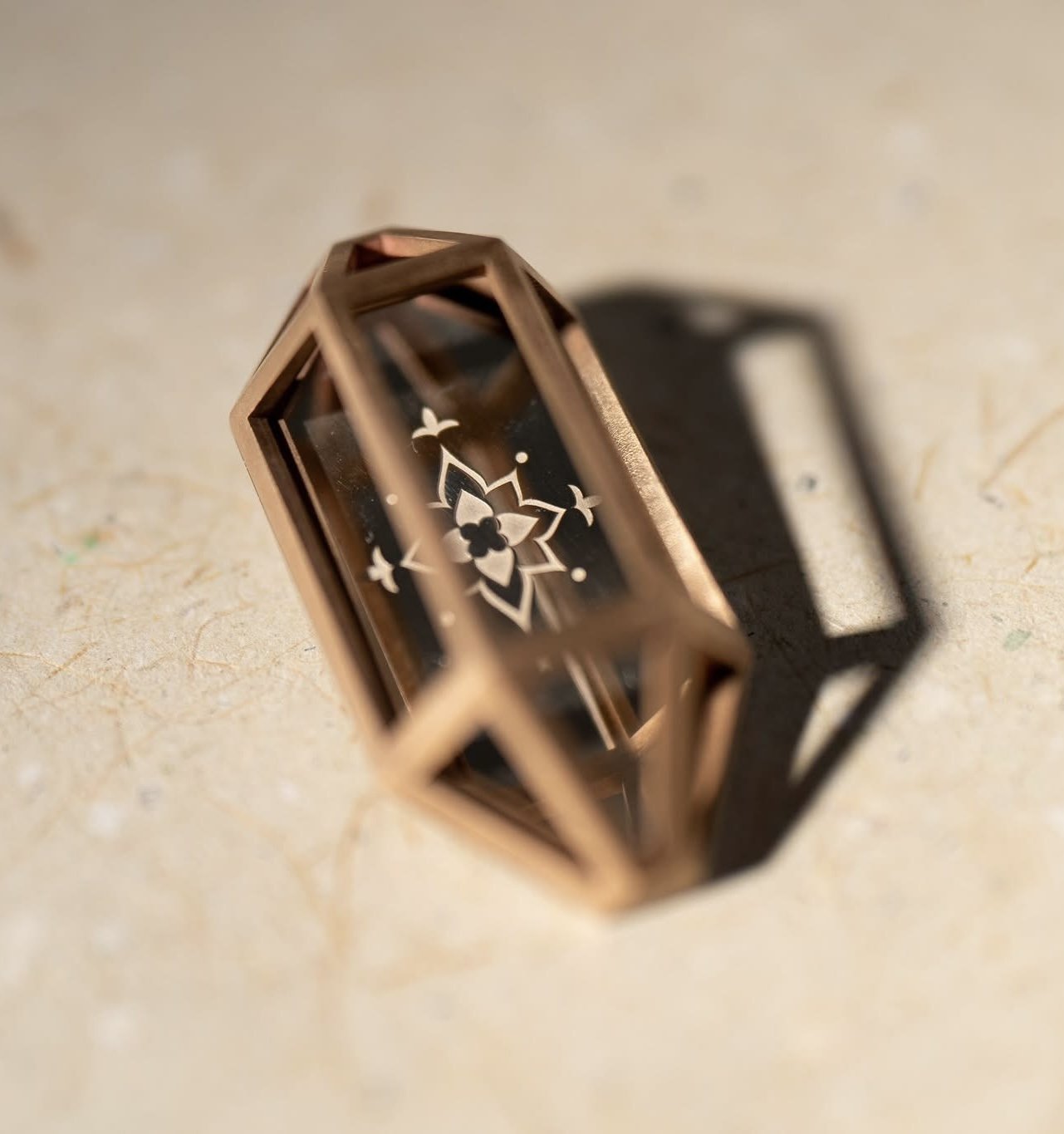 In questa spilla, la struttura del pezzo unico “Lanterna” si fa essenziale, per valorizzare il logo di The Place Firenze, ispirato alle decorazioni policrome che Leon Battista Alberti realizzò sulla facciata della Basilica di Santa Maria Novella in epoca Rinascimentale.